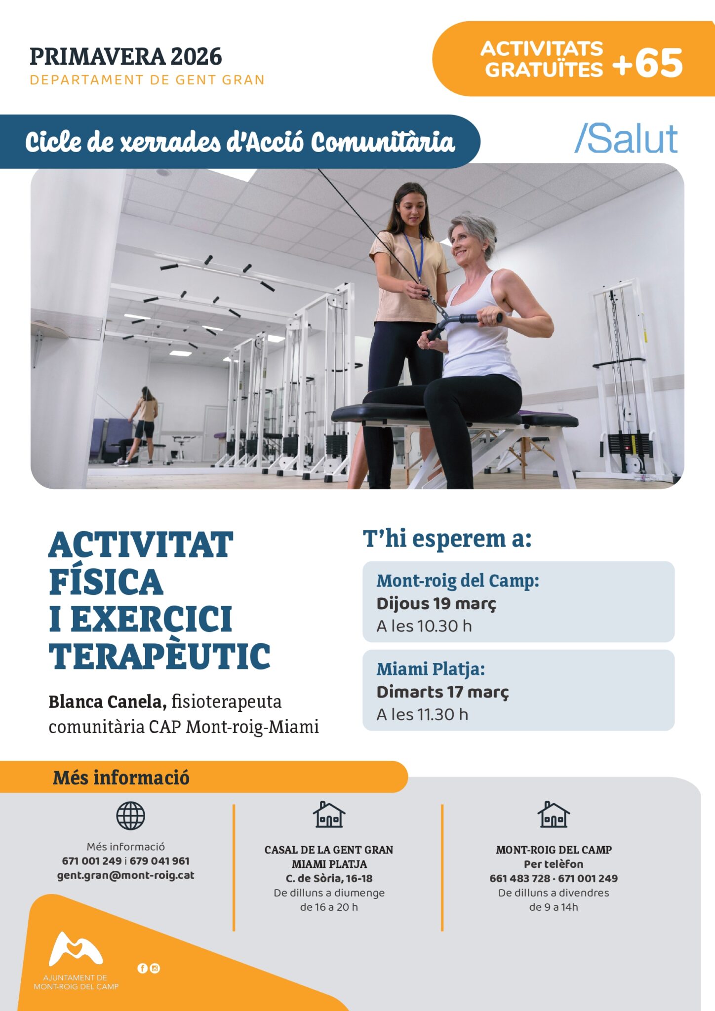 Dintre del programa d’activitats de la Gent Gran, s’ofereix aquesta activitat a càrrec de Blanca Canela, fisioterapeuta comunitària CAP de Mont-roig del Camp i Miami Platja.