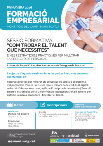 L’Ajuntament de Mont-roig del Camp, mitjançant la Regidoria d’Impuls Econòmic i Ocupació, ha posat en marxa una iniciativa pionera adreçada directament al teixit empresarial del municipi. Es tracta del primer curs destinat específicament a oferir eines als empresaris locals per optimitzar la captació de personal sota el títol “Com trobar el talent que necessites”. Aquesta jornada formativa neix amb l’objectiu de dotar les petites i mitjanes empreses de recursos pràctics que els permetin millorar els seus processos de selecció des d’una vessant estratègica i moderna. La cita tindrà lloc el pròxim dijous 30 d’abril, de 9 a 10.30 hores, a l’Ecoespai de Miami Platja, situat a la plaça de Girona. Totes les empreses interessades a participar-hi poden formalitzar la seva inscripció enviant un correu a promocio@mont-roig.cat o trucant al telèfon 977 172 527.
