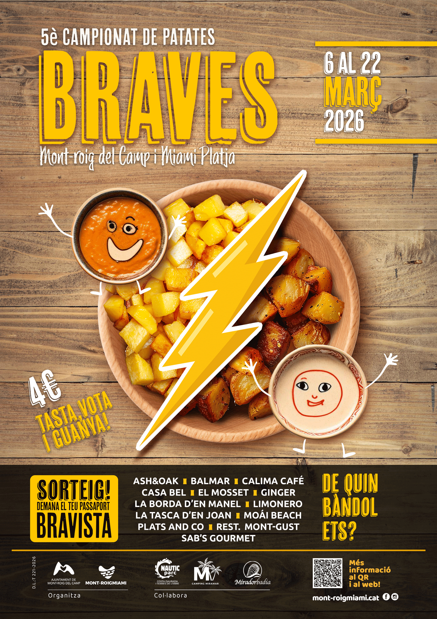 En aquesta edició hi participen 13 establiments: Ash&Oak, Braseria Pizzeria Balmar, Calima Café, Casa Bel, El Mosset, Ginger Café, La Borda d’en Manel, Limonero, La Tasca d’en Joan, Moái Beach, Plats & Co, Restaurant Mont-Gust i Sab’s Gourmet, que oferiran la seva proposta de patates braves amb elaboracions pròpies i creatives d’aquesta tapa emblemàtica. Totes les propostes opten al reconeixement de Millors Patates Braves de Mont-roig del Camp i Miami Platja2026.
