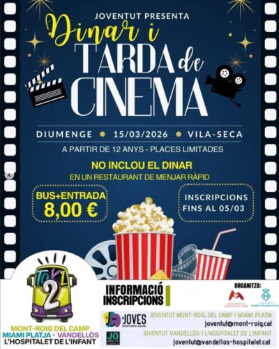 Mont-roig del Camp i Miami Platja Sortida per gaudir d'una pel·lícula en grup i compartir una estona d'oci cultural i de convivència. Una activitat per desconnectar, passar-ho bé i viure el cinema d'una manera col·lectiva. Lloc: Les Gavarres - Tarragona Preu: 10 € - Inclou entrada, transport i assegurança Inscripcions: joventut@mont-roig.cat Més de 12 anys