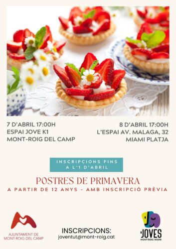 Miami Platja Un taller de receptes fàcils, divertides i per llepar-se'n els dits, aprendrem a preparar dolços saludables i amb un sabor espectacular. L'Espai Gratuït A partir de 12 anys Inscripció a joventut@mont-roig.cat