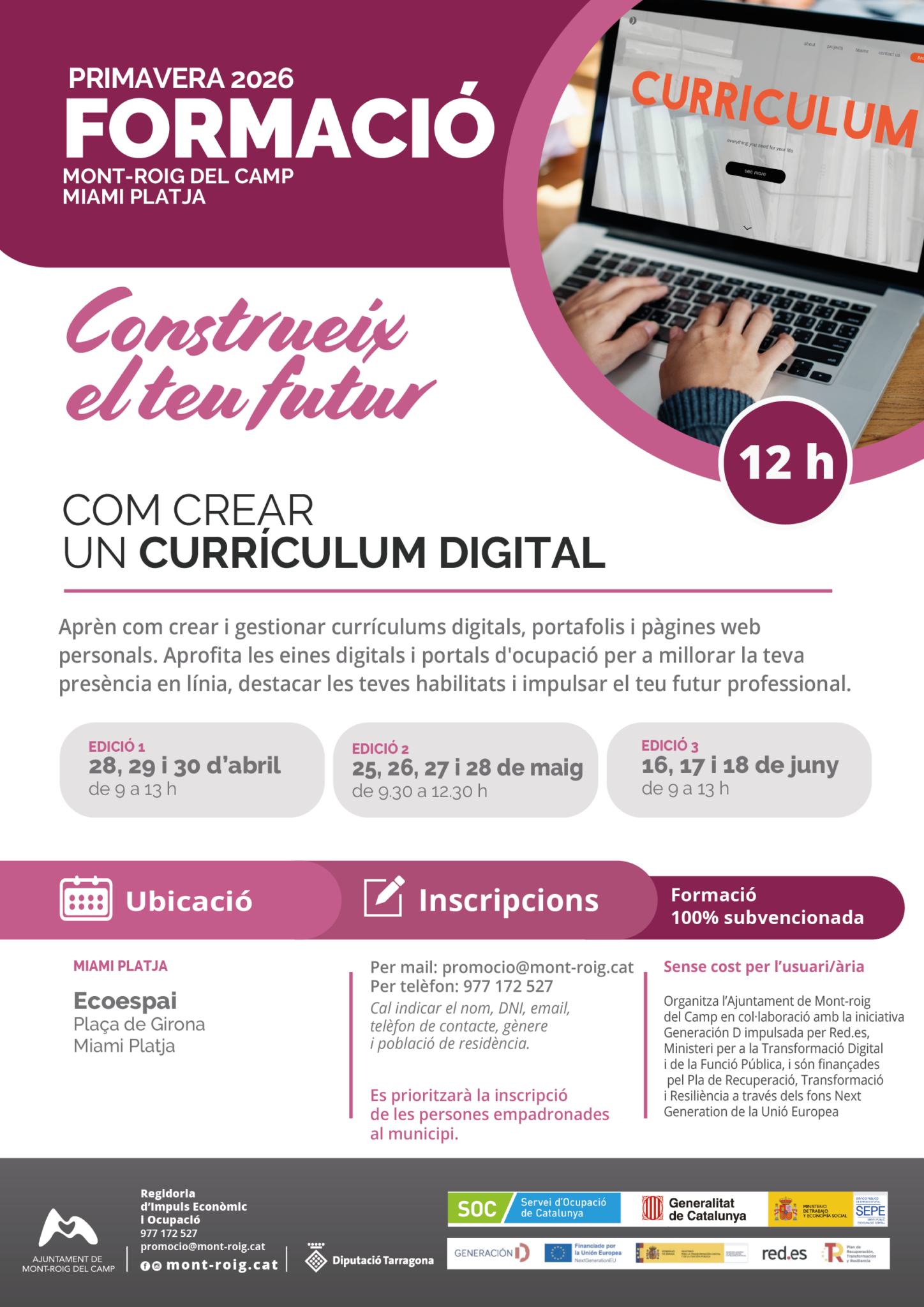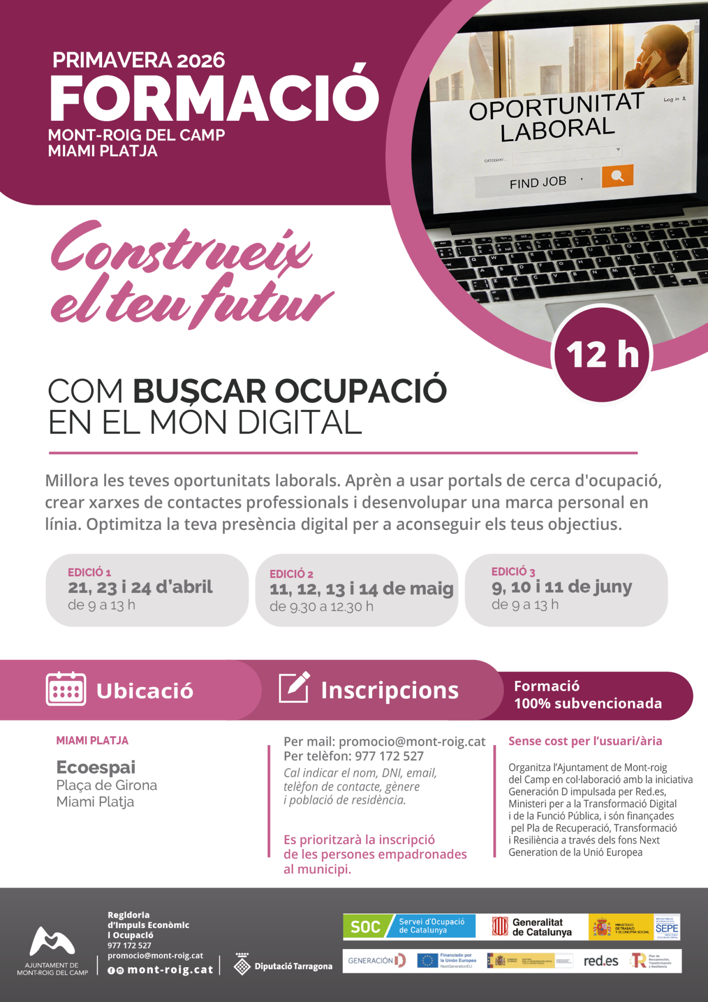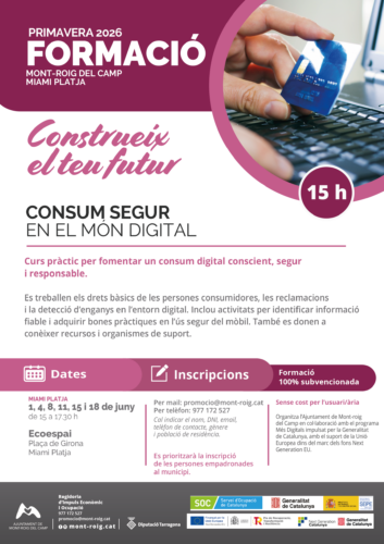 El Ayuntamiento de Mont-roig del Camp refuerza su compromiso con la mejora de las competencias tecnológicas de sus vecinos y vecinas. A través del Área de Impulso Económico y Empleo, se ha lanzado una nueva programación de cursos bajo el lema Construye tu futuro, diseñada para dar respuesta a los retos del mercado laboral actual y la transformación digital del comercio local. Todas las sesiones se llevarán a cabo en el Ecoespai de Miami Platja.